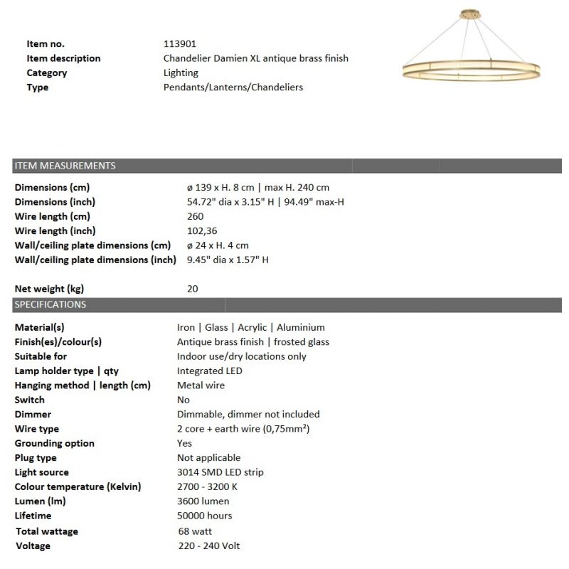 Dacă sunteți în căutarea unui candelabru cu influență Art Deco, atunci nu căutați mai departe. Candelabru Damien XL are mai mult de un indiciu de decadență Art Deco cu diametrul său de 140 cm. Cadrul circular cu finisaj alama antic este prevăzut cu tije din sticlă mată și așteaptă să reflecte lumina într-o sută de moduri diferite. Inelul poate fi agățat în orice poziție dorită reglând lungimea cablurilor.