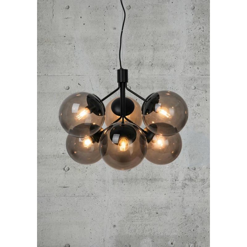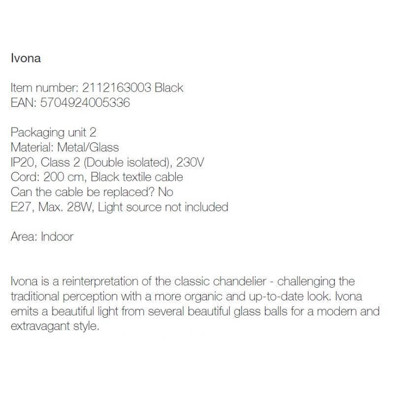 Ivona este o reinterpretare a candelabrului clasic - provocând percepția tradițională cu un aspect mai organic și actualizat. Ivona emite o lumină frumoasă din mai multe bile de sticlă frumoase pentru un stil modern și extravagant. Oțelul negru și sticla fumurie creează un aspect industrial rece. Adăugați un bec decorativ pentru a vă crea propria expresie de design.