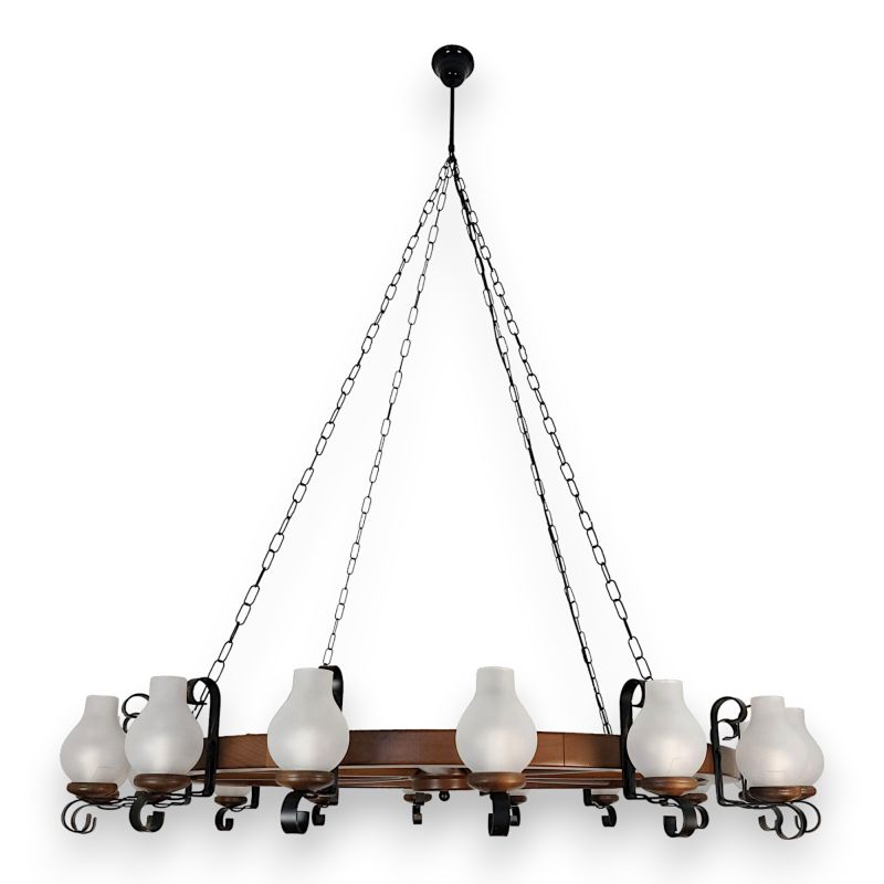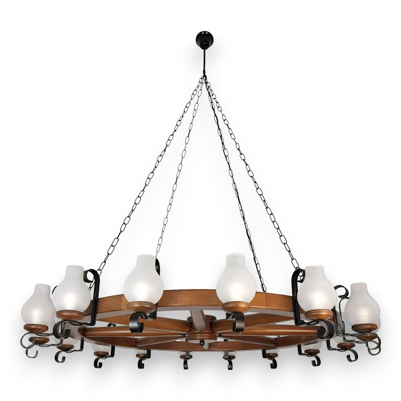 | Descriere | lemn de fag, fier forjat patinat si abajururi mate tip opait |