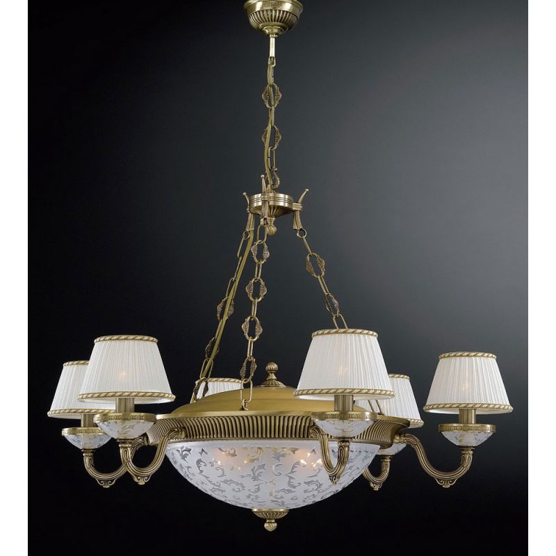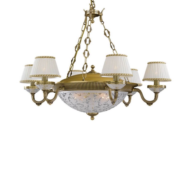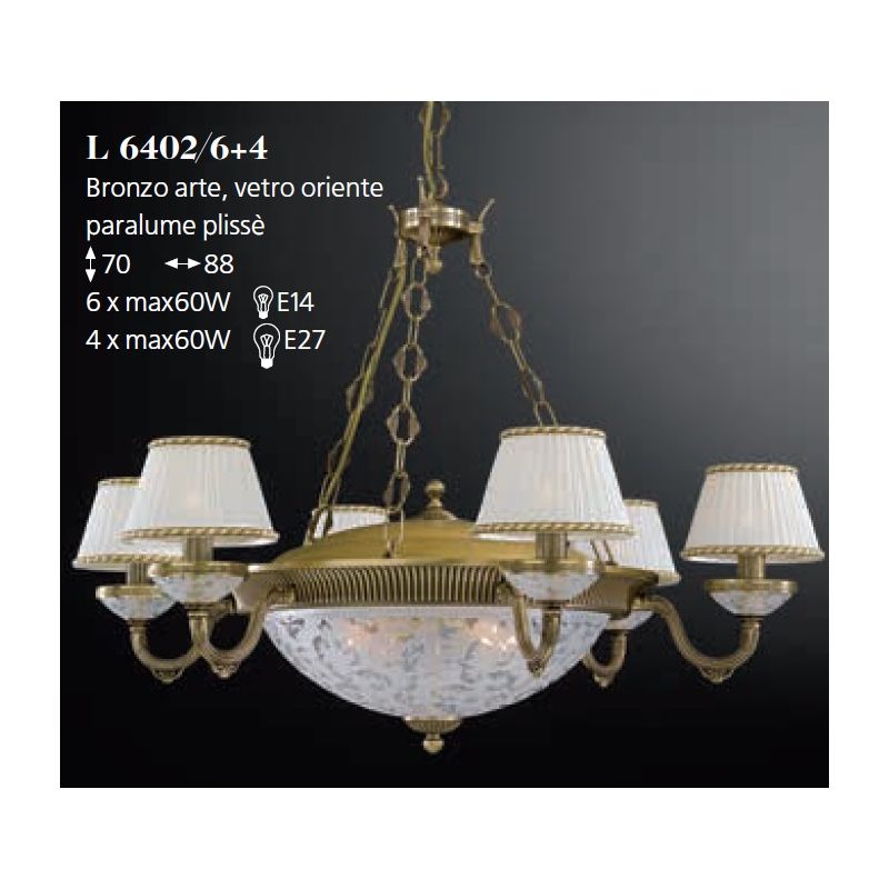 | Descriere | cadru din alama turnata finisaj bronz art, sticla satinata decorata, abajur textil fin plisat |