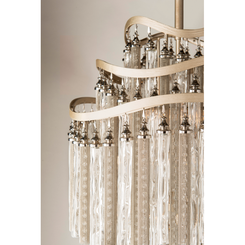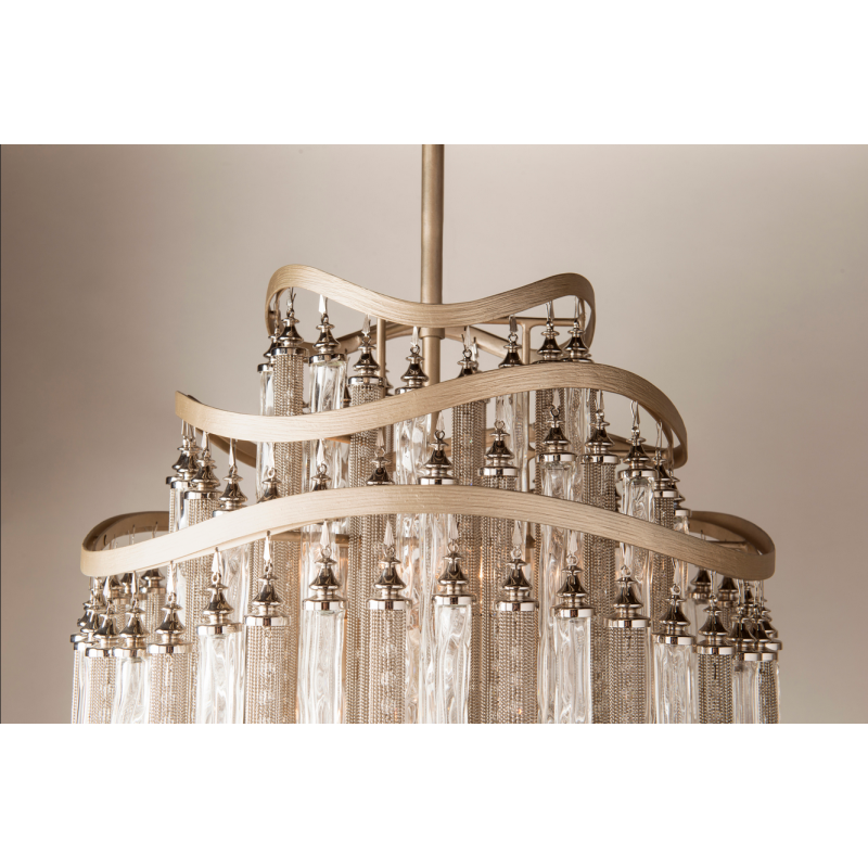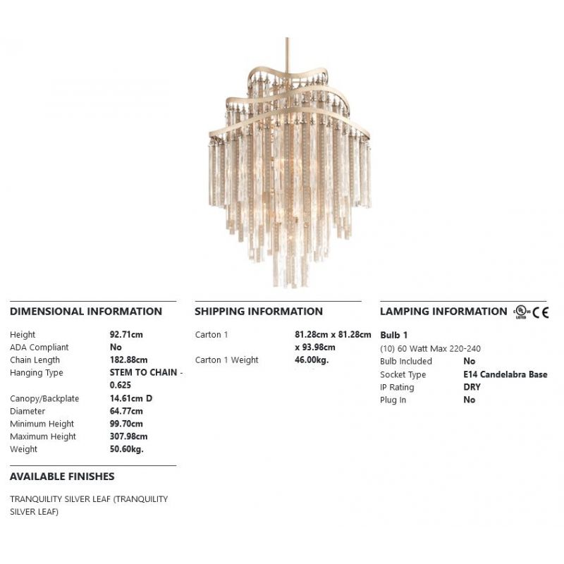 Materiale | cadru din fier prelucrat manual finisat în foiță argintie, elemente ornamentale: ciucuri finisaj nickel, șiraguri de cristale și sticlă tubulară transparentă |
