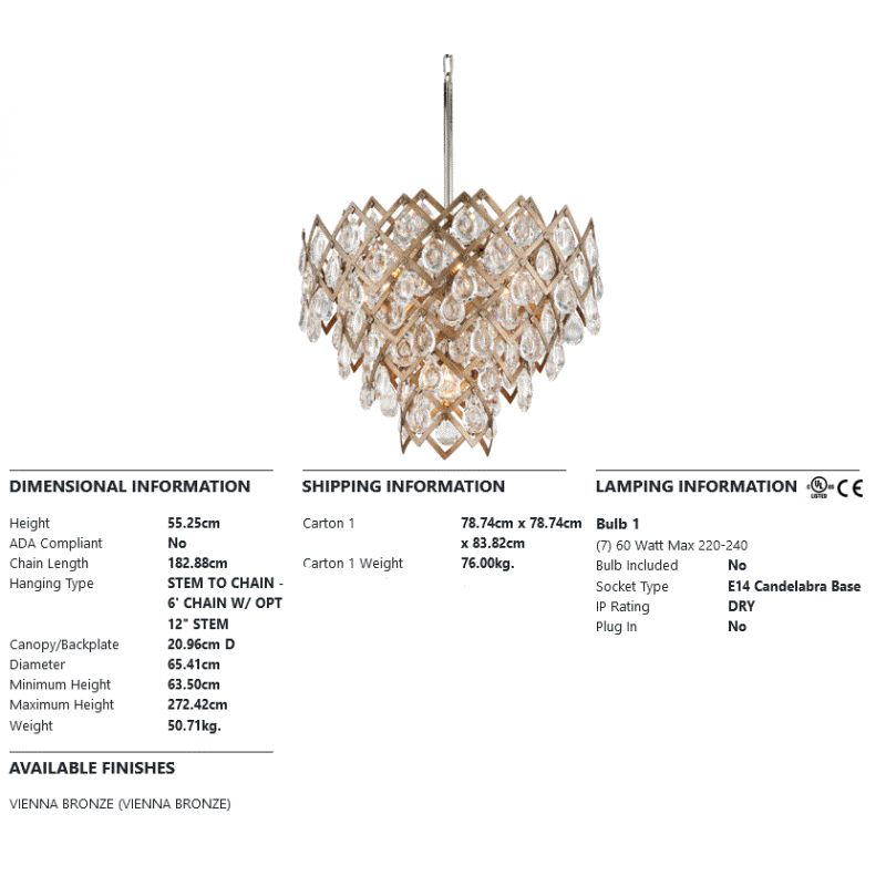 | Dimensiuni | diametru: 65,41cm; inaltime: corp-55,25cm + lant-182,9cm |