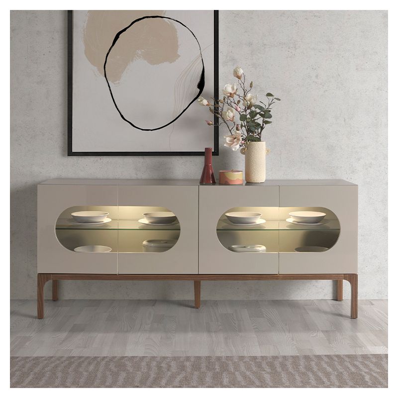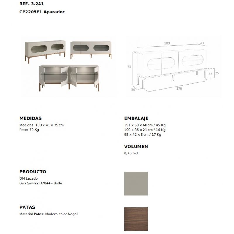 | Materiale | MDF gri, picioare din lemn de culoarea nucului, raft de sticla detasabil, usi cu doua orificii frontale din sticla, iluminare LED |