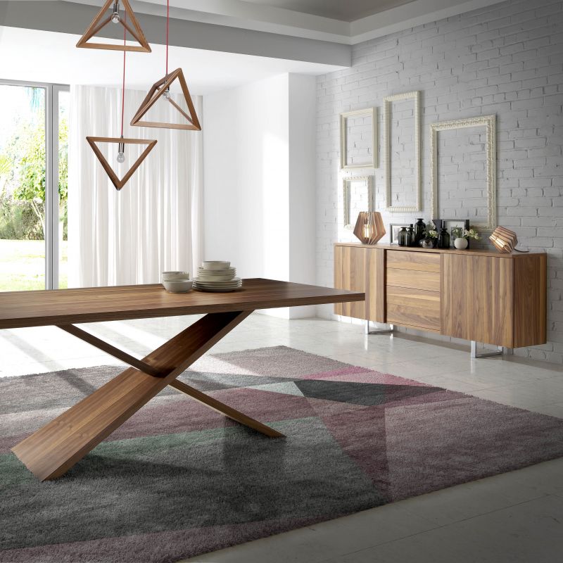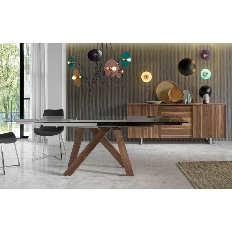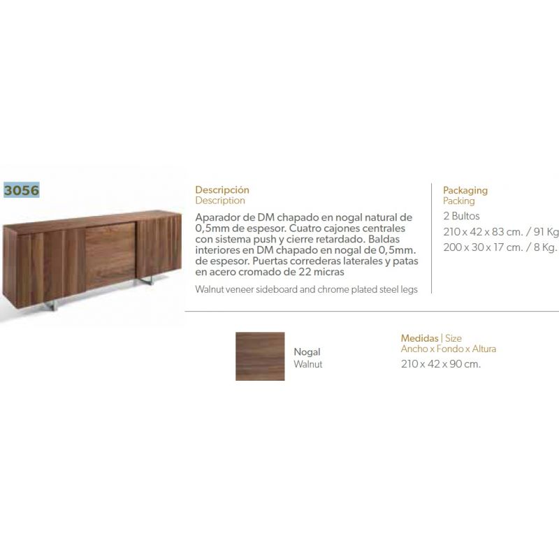 | Descriere | MDF furniruit cu furnir din lemn de nuc de 0,5mm grosime, patru sertare centrale cu functia Push si Soft Closed System, doua usi culisante, picioare din otel cromat |