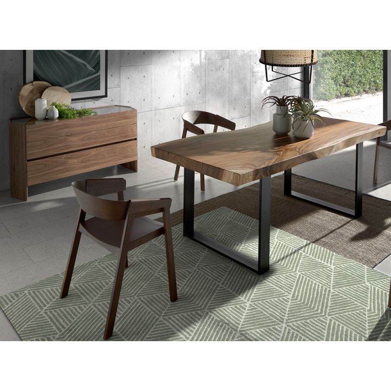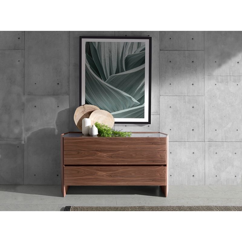 Comoda hexagonala cu design modern realizată din MDF furniruit de nuc gros de 0,5 mm și și un blat original din sticlă calită hexagonală. O comoda de stil elegant și sofisticat ideala pentru a oferi o notă de căldură și stil pe care o căutați în casa dvs., precum și pentru a menține totul în ordine datorită spațiului său de depozitare cu sertare frontale cu sistem de deschidere soft-closing.