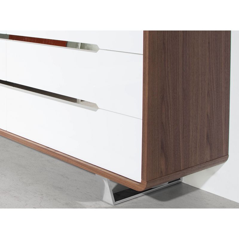 Comoda cu un design modern original din MDF furniruit cu nuc natural grosime de 0,5 mm. Picioarele sale din oțel inoxidabil cromat de 22 de microni îi conferă nota de eleganță și avangardă pe care o cauți în dormitorul tău. Păstrați totul la locul său datorită spațiului său mare de depozitare cu cele șase sertare frontale lacuite DM în alb lucios RAL9003 cu sistem de închidere uşoară.