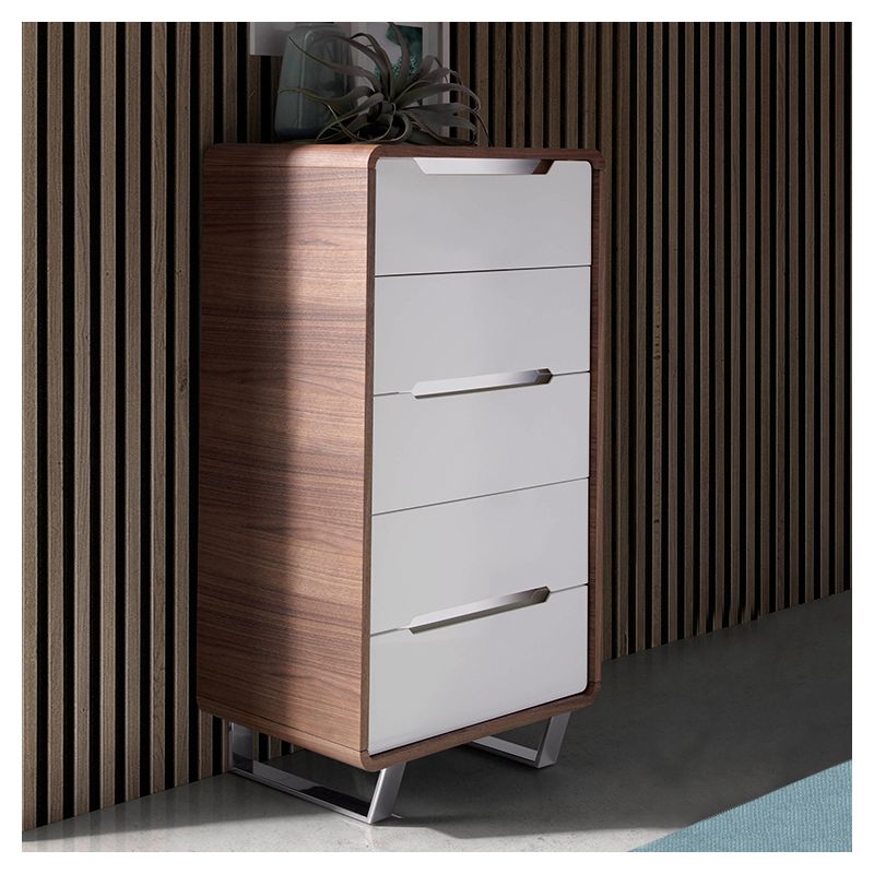 Chifonier cu un design modern original realizat din MDF furniruit cu nuc natural grosime de 0,5 mm. Picioarele din oțel inoxidabil cromat de 22 de microni îi conferă un plus de eleganță și avangardă pe care îl căutați în dormitorul dvs. Păstrați totul la locul său datorită spațiului său mare de depozitare cu cele cinci sertare frontale din DM lăcuite în alb lucios RAL9003 cu sistem de închidere uşoară.