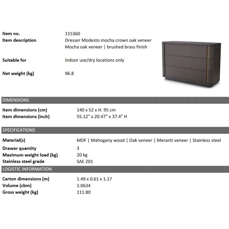 | Descriere | MDF, furnir de stejar, furnir de Meranti, lemn de stejar finisaj cafeniu, otel finisaj alama |