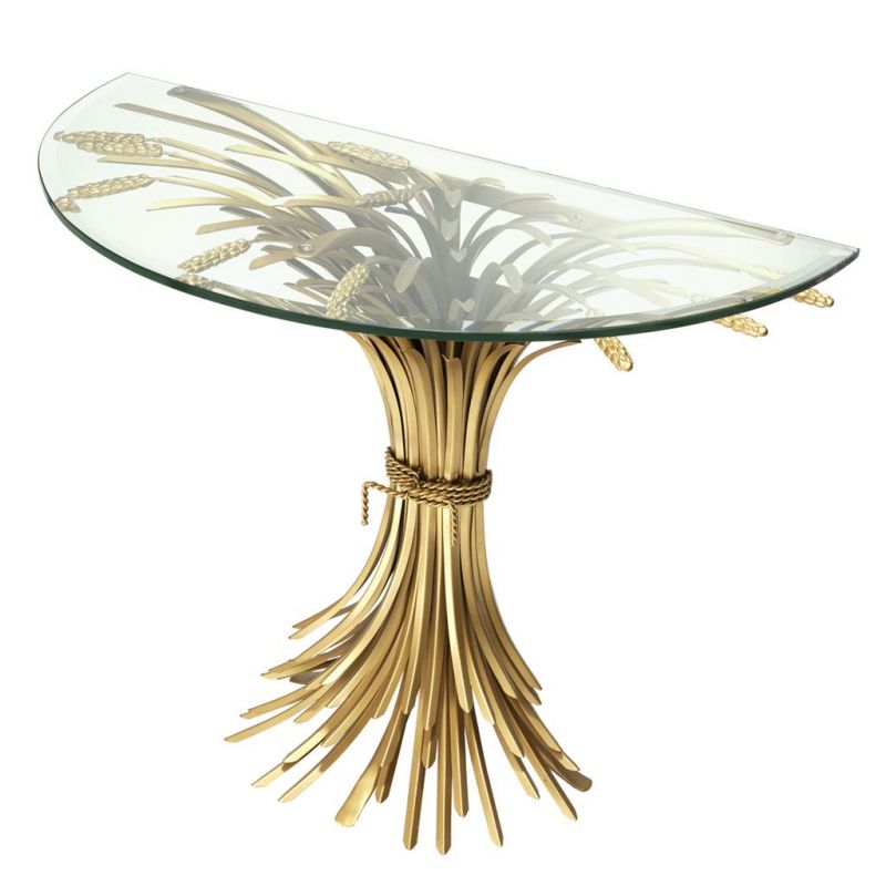 Consola design LUX Bonheur reflecta unicitatea meticuloasei baze cu un design ce aduce cu spicele de grau in finisaj auriu antic. Impreuna cu blatul din sticla tesita aceasta piesa de mobilier va adauga o nota exclusiva interiorului casei dvs.