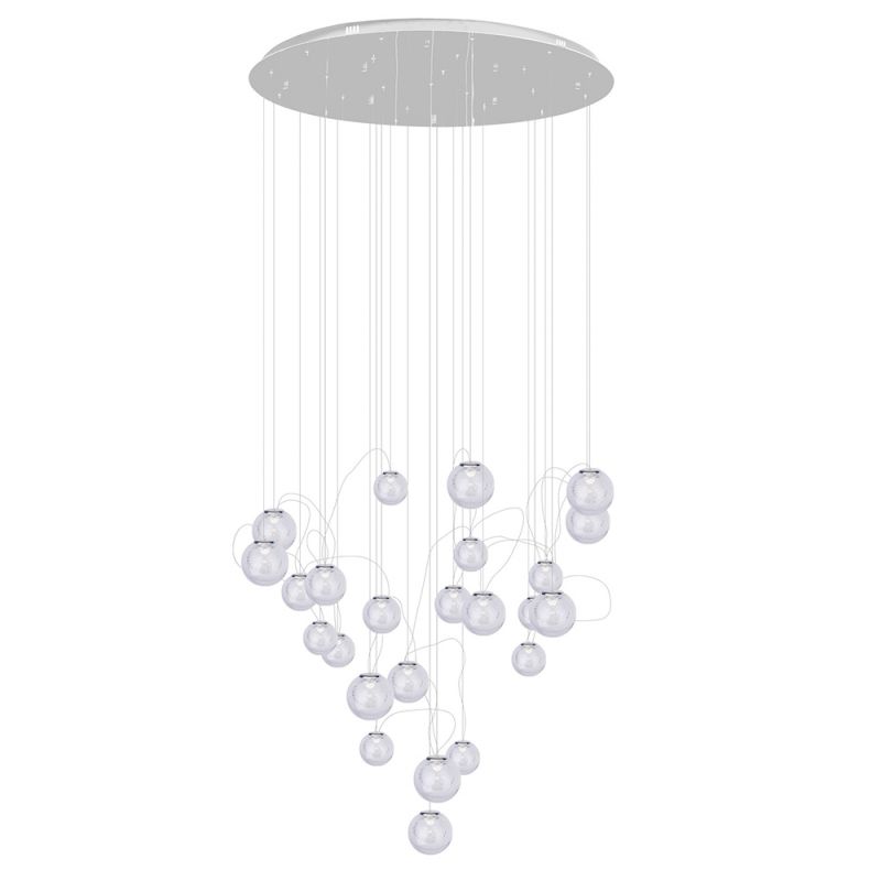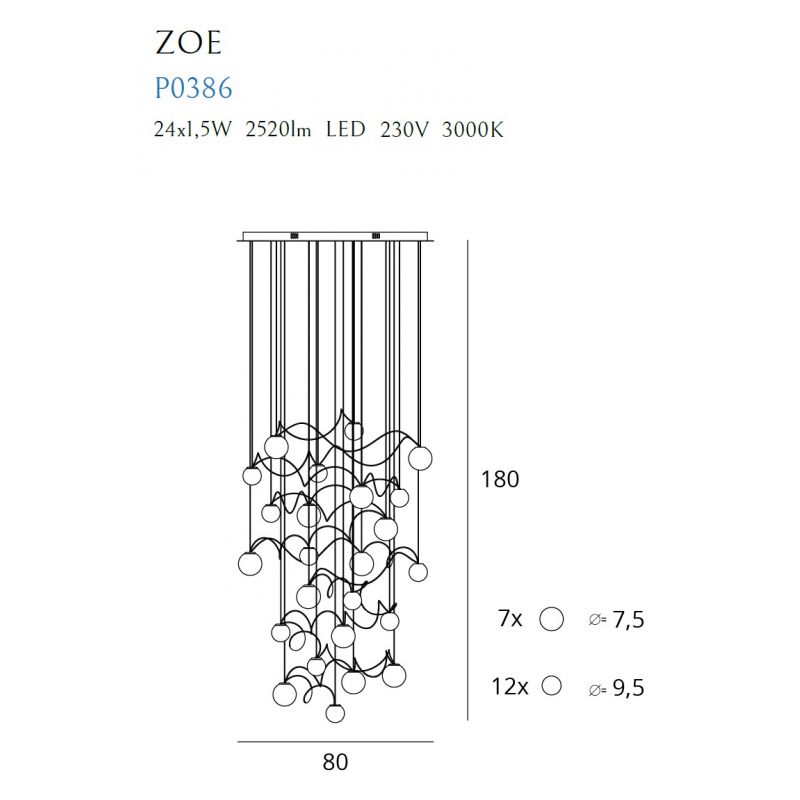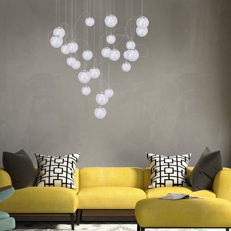 O compoziție dinamică de bile luminoase de sticlă, umplute cu sute de bule minuscule, fiecare dintre ele refractând lumina - acestea sunt corpuri de iluminat Zoe. Pline de lumină, bilele de sticlă grele sunt un răspuns interesant la referințele la modă în anii 90, aceasta este perioada de popularitate a cărămizilor de sticlă, care în zilele noastre se află într-o adevărată renaștere. Corpurile de iluminat Zoe sunt un complement minunat pentru holul hotelului, camera de zi spațioasă, hol sau casa scării.