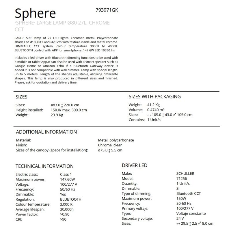 | Descriere | metal finisaj cromat, pendule sferice de diametru: 10, 12 si 20 cm, policarbonat cu textura în interiorul abajurului |