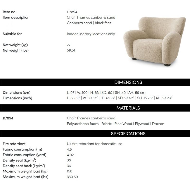 | Materiale | tapiterie din tesatura Canberra sand, placaj, spuma poliuretanica, lemn de pin |
