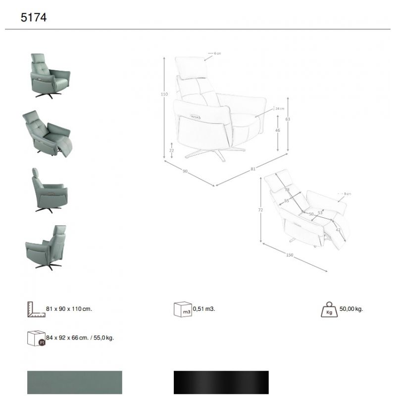 | Materiale | picioare din otel negru, tapiterie din piele naturala, umplutura spuma, sistem relaxare electric, port USB |