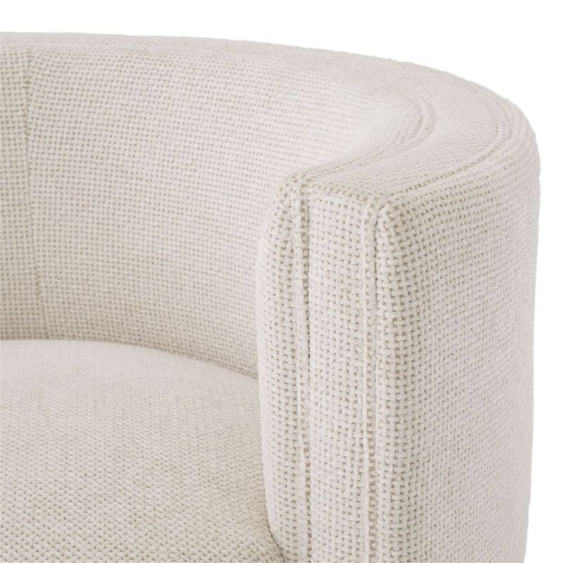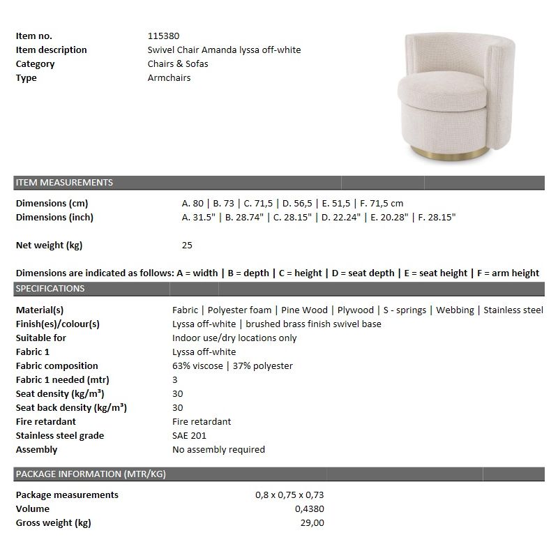 | Descriere | structura din lemn de pin, tesatura lyssa off-white 63% viscoza/ 37% poliester, placaj, baza pivotanta din metal finisaj auriu, umplutura spuma |