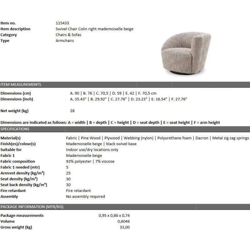 Fotoliu confortabil Colin vine cu un design chic si elegant cu o tapiterie bej mademoiselle si o baza pivotanta. Colin este perfect pentru dressing, camera de zi, cafenea sau magazin. Acest fotoliu va adauga cu siguranta o nota de lux si eleganta.