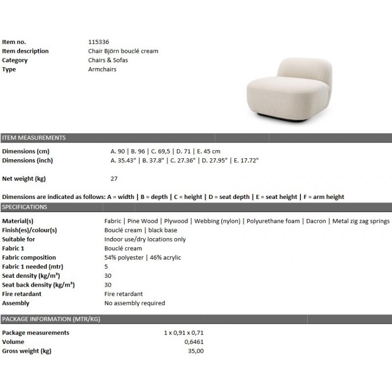 | Descriere | Tesatura boucle crem 54% poliester/ 46% acril, lemn de pin, placaj, umplutura spuma poliuretanica |