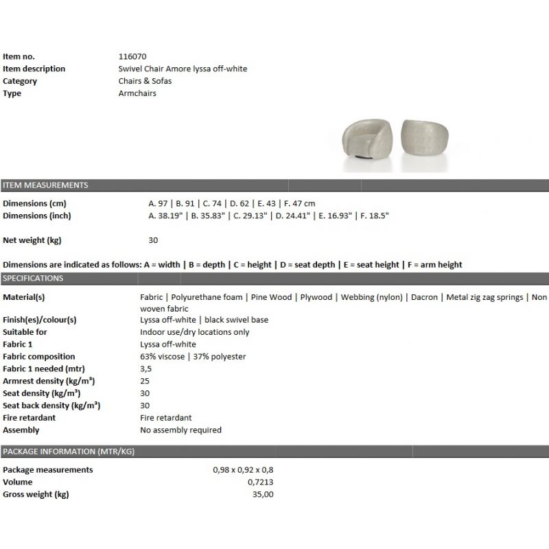 Fotoliu confortabil Amore vine cu un design chic si elegant cu o tapiterie lyssa off-white si o baza pivotanta. Amore este perfect pentru dressing, camera de zi, cafenea sau magazin. Acest fotoliu va adauga cu siguranta o nota de lux si eleganta.
