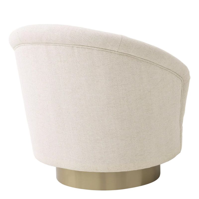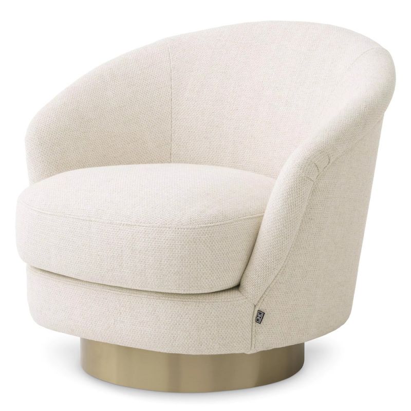 | Descriere | Fotoliu realizat din lemn de pin, placaj, tapiterie din tesatura pausa natural- 50% viscoza/ 20% in/ 20% acril/ 10% poliester, baza pivotanta din otel inoxidabil finisaj alama periata, umplutura spuma |