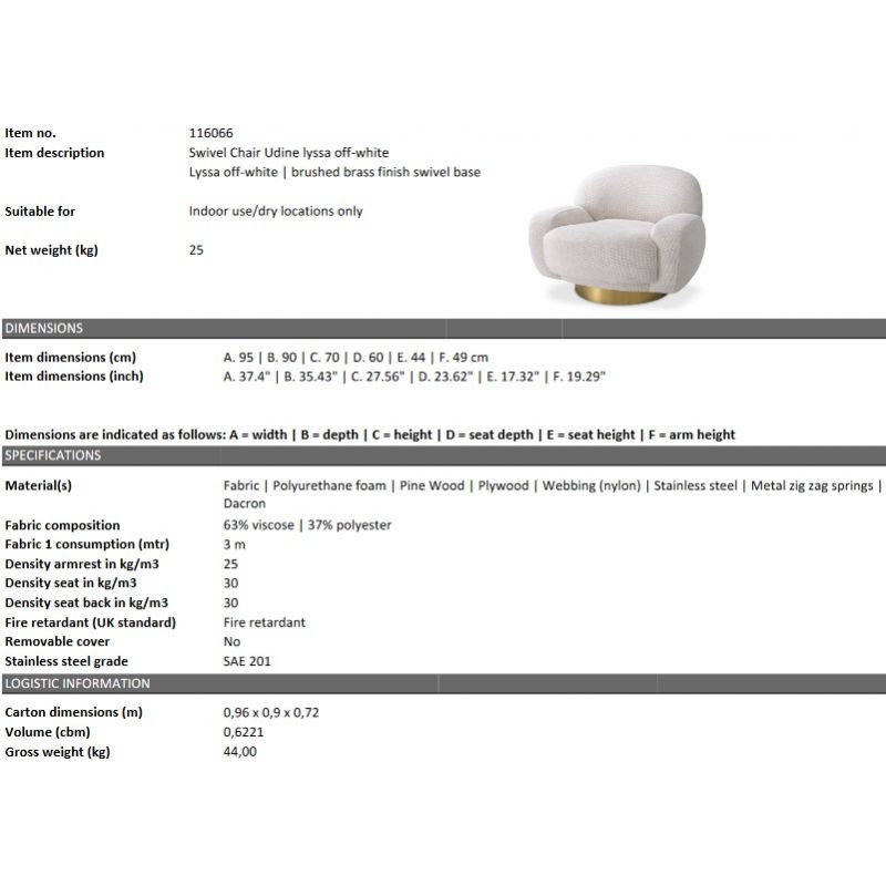 Fotoliul confortabil Udine vine cu un design chic si elegant cu o tapiterie lyssa off-white si o baza pivotanta. Udine este perfect pentru dressing, camera de zi, cafenea sau magazin. Acest fotoliu va adauga cu siguranta o nota de lux si eleganta.