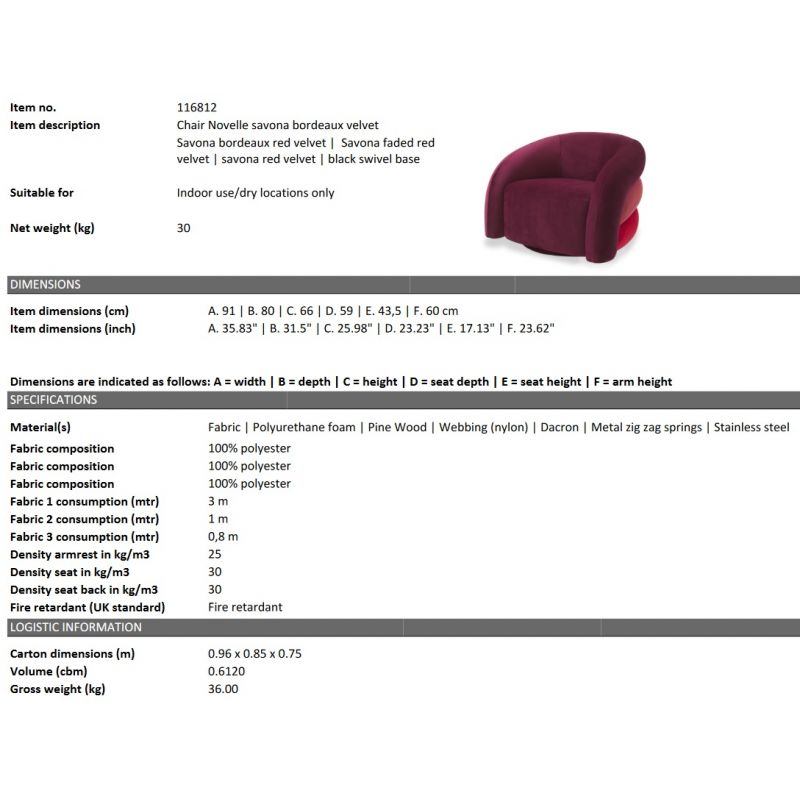 | Materiale | baza pivotanta, otel inoxidabil, tapiterie din catifea savona 100% poliester, umplutura spuma |