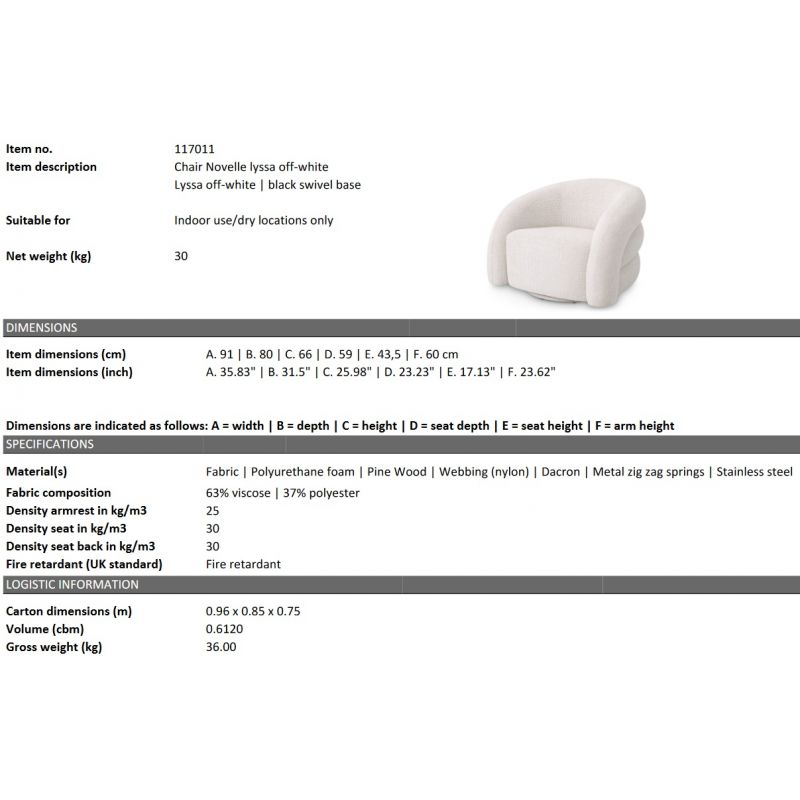 | Materiale | baza pivotanta, otel inoxidabil, tapiterie din tesatura Lyssa off-white 63% vascoza, 37% poliester, umplutura spuma |