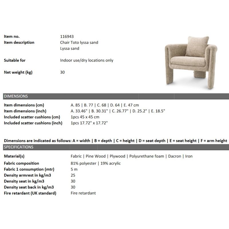 | Materiale | tesatura Lyssa sand- 81% poliester/ 19% acrilic, lemn de pin, placaj, umplutura spuma |