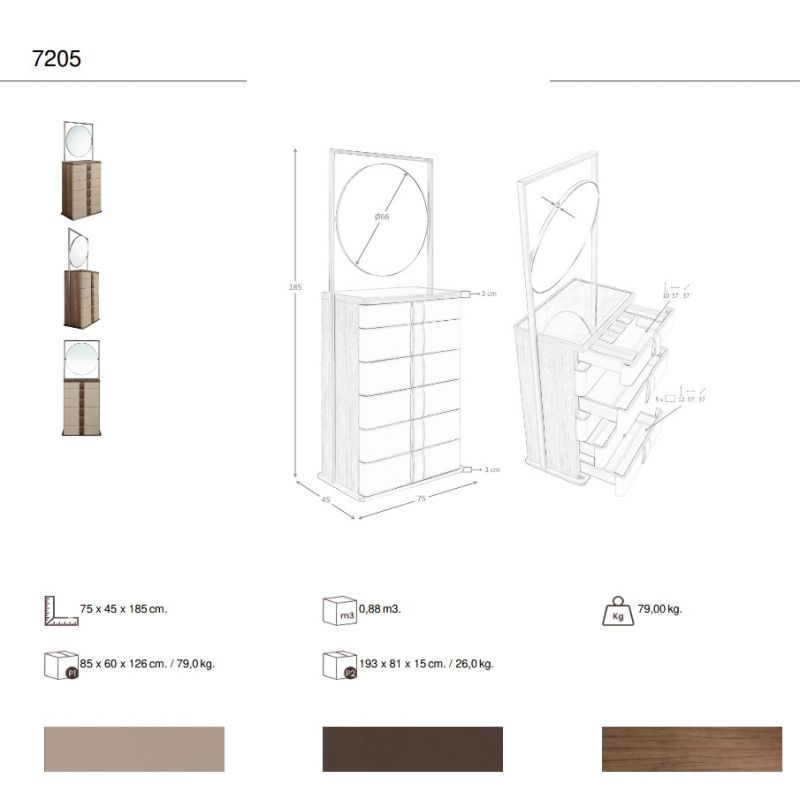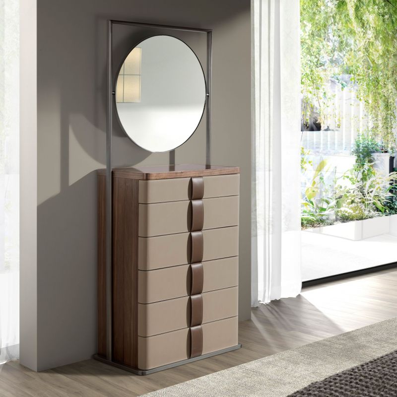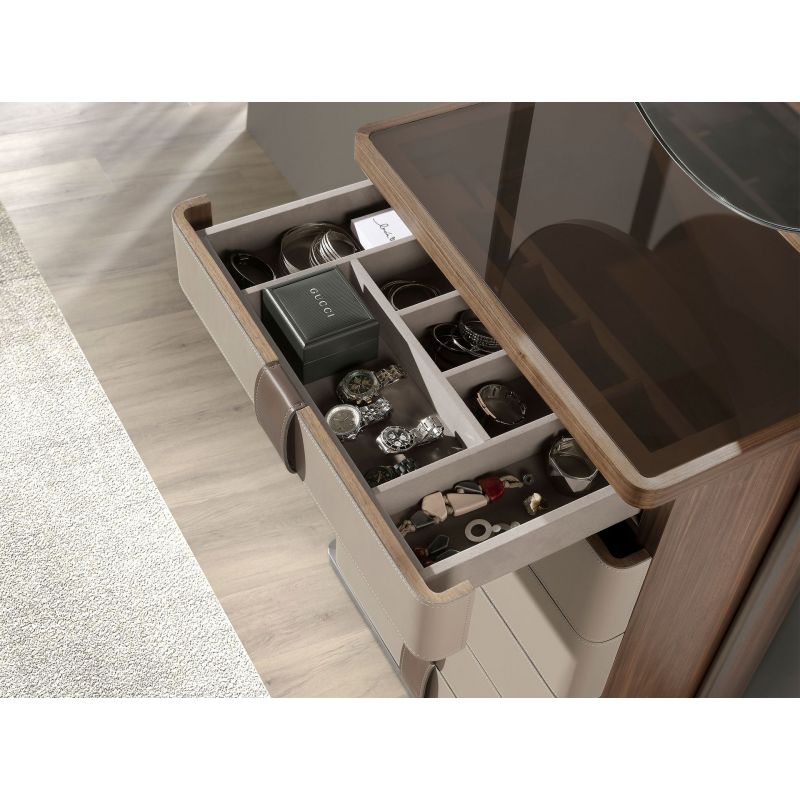 | Materiale | furnir din lemn de nuc, piele de vaca de culoarea nurcii, manere din piele maro, otel inoxidabil, oglinda rotativa, sertar pentru bijuterii, ceasuri si accesorii mici, sticla maro fumuriu |