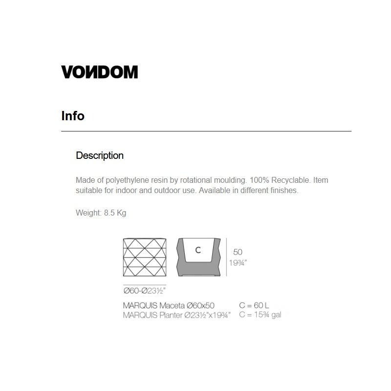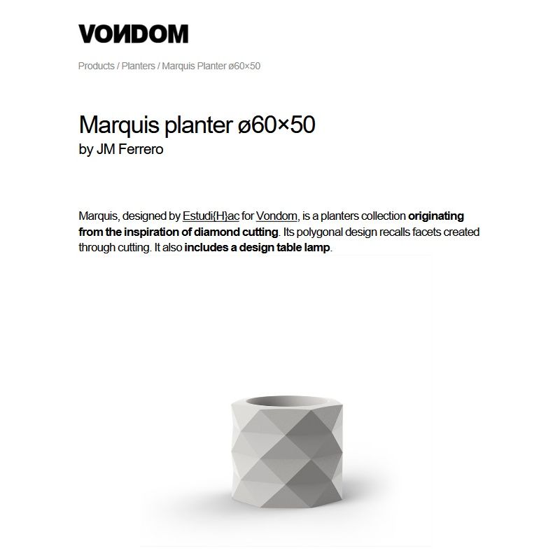 Design-ul neconventional al ghiveciul Marquis cu siguranta va asigura o prima impresie spectaculoasa. Realizat din termoplastic durabil, ghiveciul Marquis este rezistent la intemperii, de aceea poate fi amplasat atat in exterior pe o terasa sau intr-o curte moderna, cat si in interior intr-o cafenea sau un restaurant contemporan.