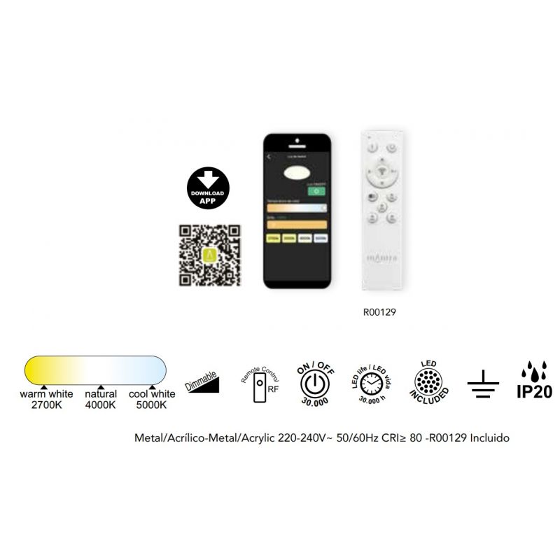 | Informatii produs: | Lustra Smart este controlabila de pe telefon/ tableta folosind aplicatia Mantra sau din telecomanda cod R00129 inclusa in pret |