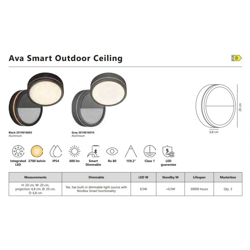Putere | 9,5 Watt LED integrat 600Lm, 2700K, are conexiune Bluetooth controlul luminii de pe telefon cu control vocal sau prin intermediul Nordlux Smart Sensor |