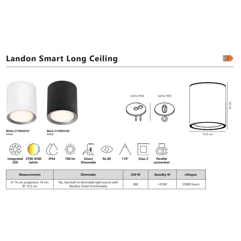 | Informatii produs: | Landon spot aplicat, puteți reduce și aprinde lumina folosind aplicația Nordlux Smart. De asemenea, puteți regla lumina de la alb rece la alb cald în funcție de nevoile dvs. Protecția IP ridicată (IP44) il face să fie potrivit pentru baie. |
