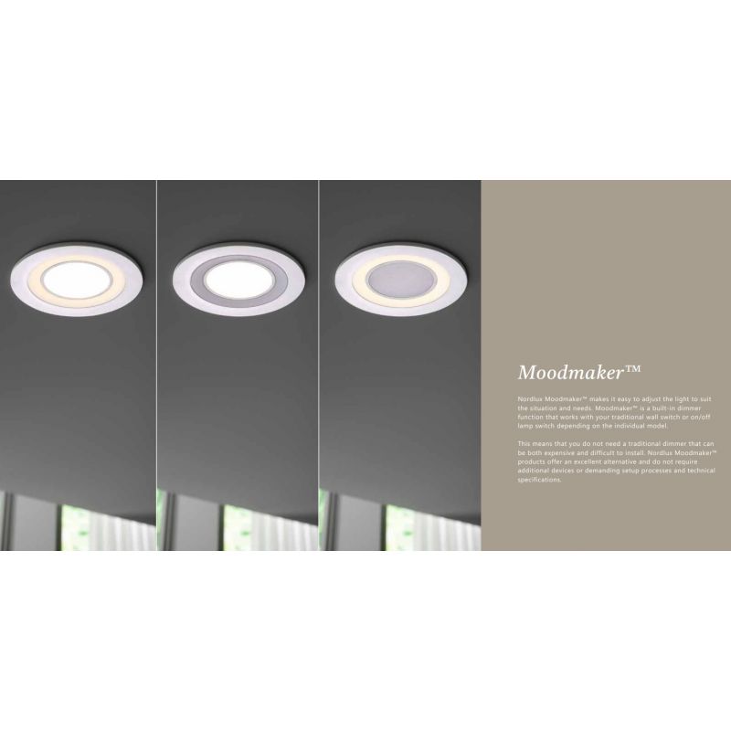 Corpul de iluminat LED încastrabil cu funcția MOODMAKER integrata, permite instalarea iluminării cu MOODMAKER-ul care funcționează cu un intrerupator tradițional, ceea ce înseamnă ca nu este necesară achizitionarea unui dimmer, iar cu un singur clic, poate fi comutată in cele 3 pozitii de iluminare. Conectarea paralelă este posibilă.