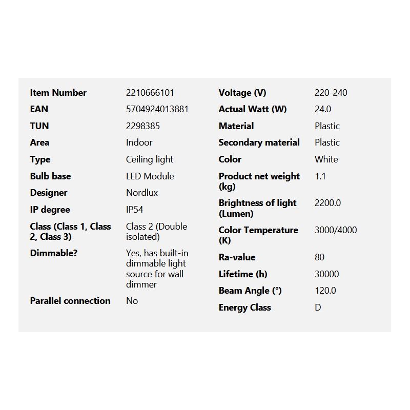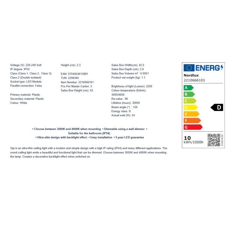 Descriere | Oja este o plafonieră ultra-subțire, cu un design modern și simplu, cu un grad IP ridicat (IP54) , lampa rotundă emite o lumină frumoasă și funcțională, alegeți între 3000K și 4000K atunci când montați lampa. |