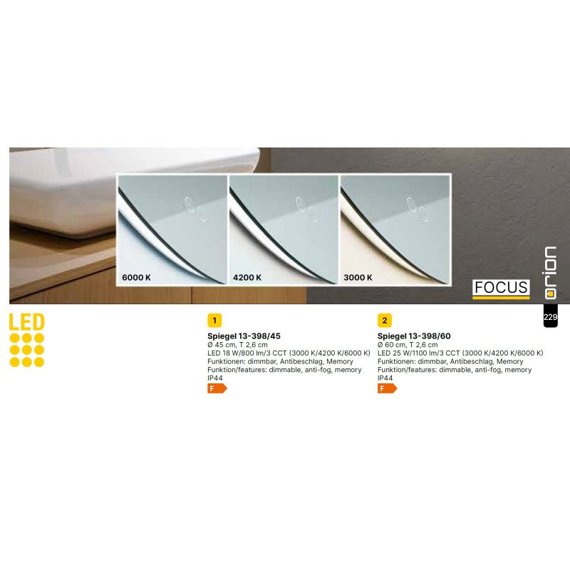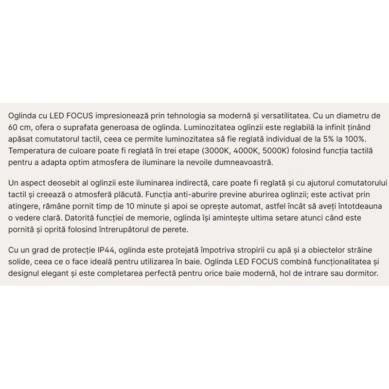 | Informatii produs: | oglinda cu iluminat LED dimabil si protectie la umiditate IP44, reglare luminozita de la 5% la 100%, temperatura de culoare 3CCT (3000K/4200K/6000K), iluminare indirecta reglabila activata de comutatorul tactil pentru a crea o sursa de lumina suplimentara |