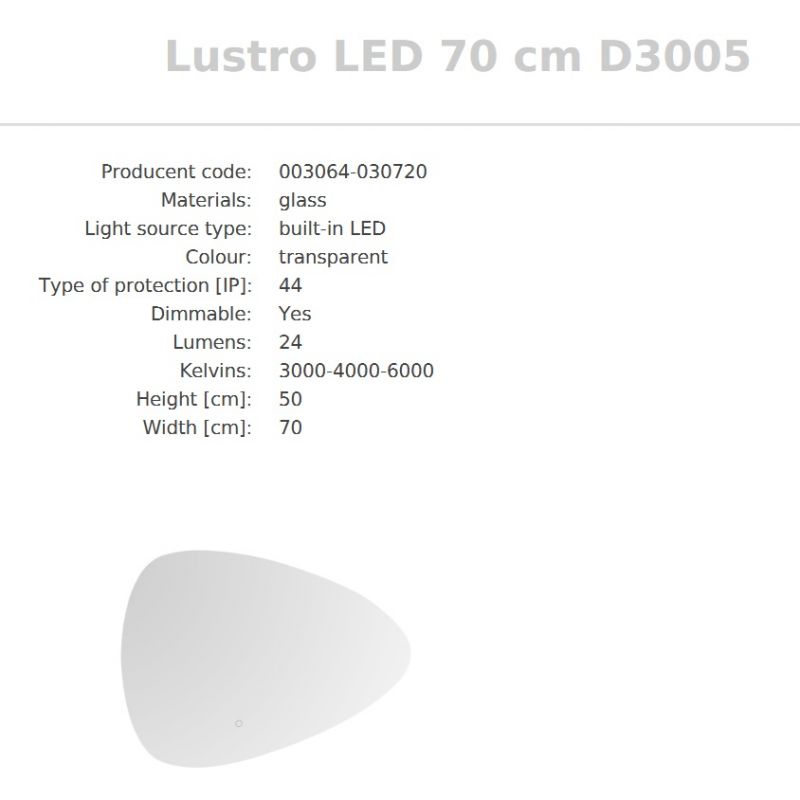 | Informatii produs: | Oglinda pentru baie cu iluminat LED, protectie IP44, temperatura de culoare activata de comutatorul tactil (3000K/4200K/6000K) |