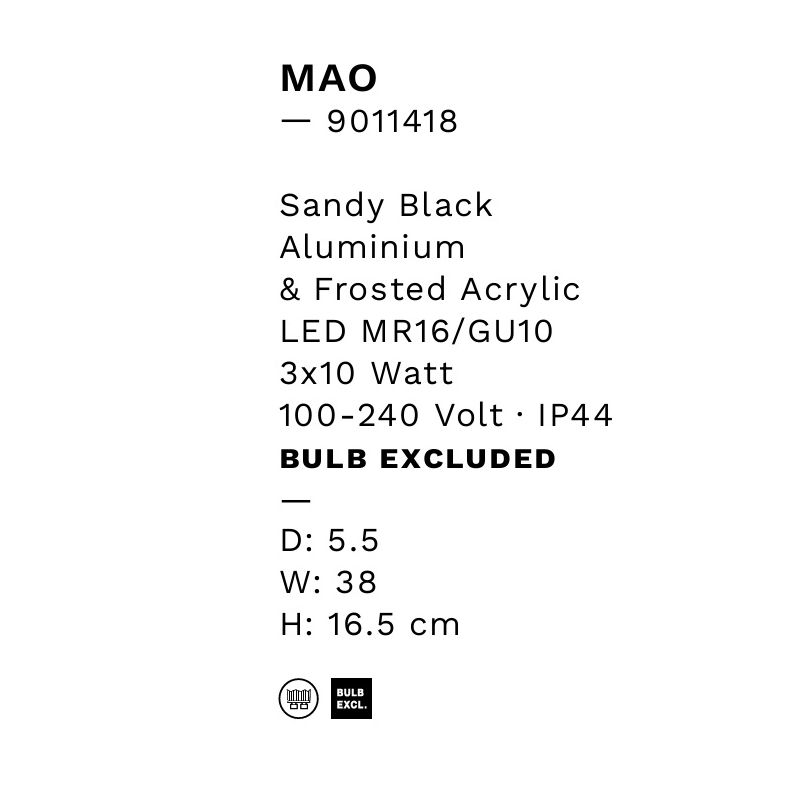 | Putere | LED MR16/GU10 3x10 Watt 100-240Volt IP44 bec exclus |