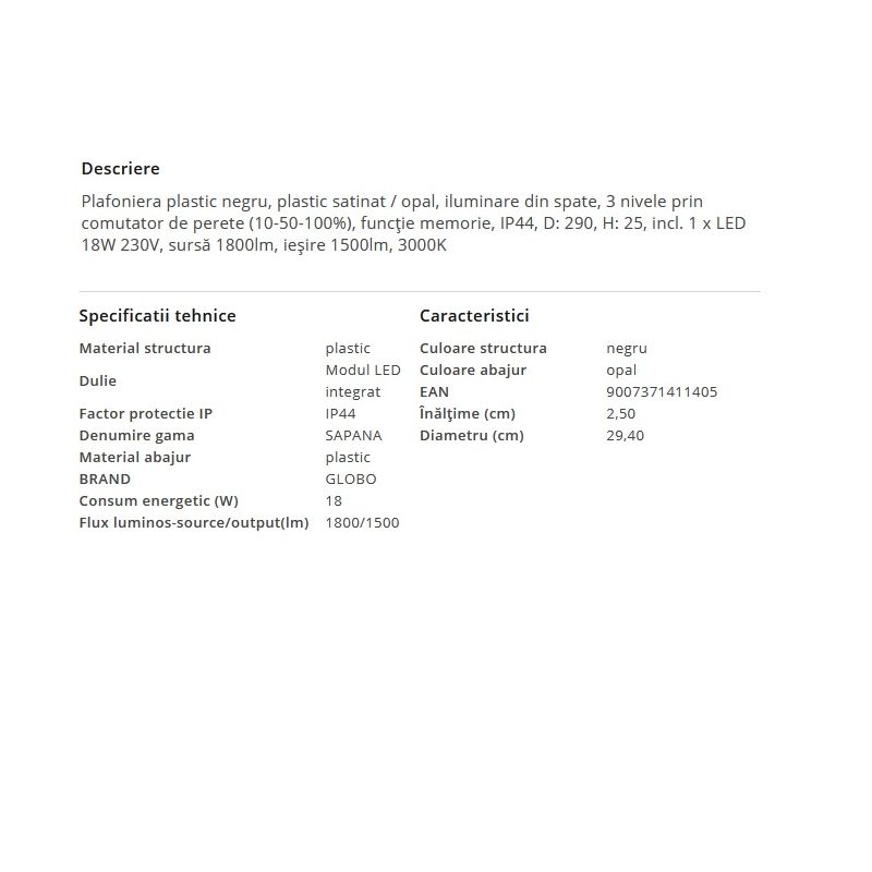 | Putere | 18W modul LED integrat 1500Lm 3000K inclus in pret |