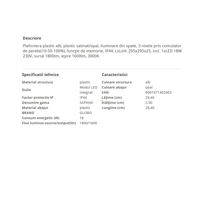 | Putere | 18W modul LED integrat 1500Lm 3000K inclus in pret |