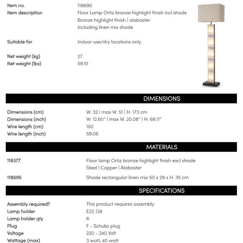 | Dimensiuni | abajur 50x29cm; inaltime lampa:173cm |