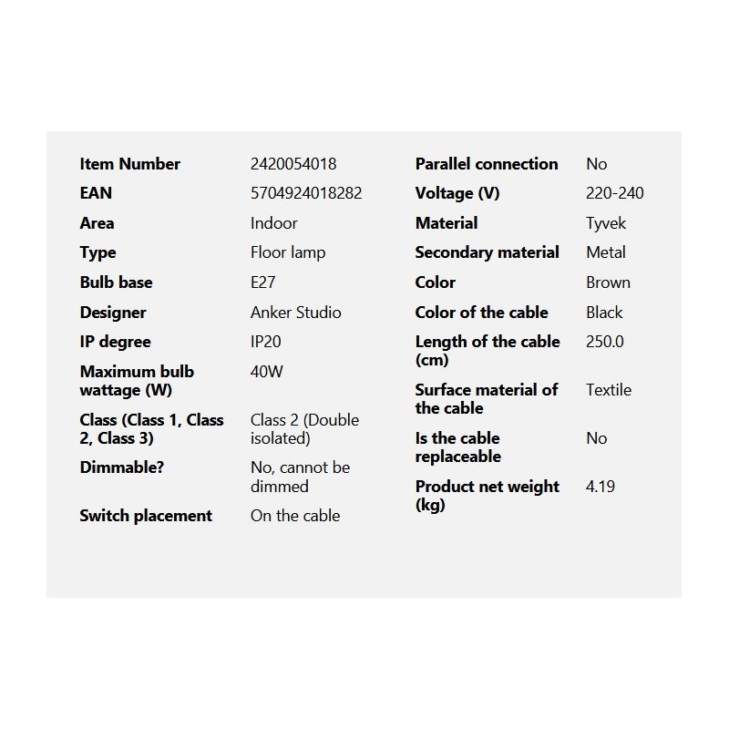 | Materiale | metal finisaj maro, abajurul este realizat în întregime din Tyvek - un material cunoscut pentru durabilitatea și difuzia uimitoare a luminii |