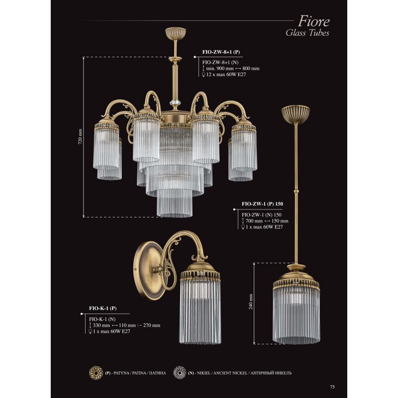Seria Fiore aduce prestigiul și luxul lămpilor clasice într-un interior modern. Cristalele subliniază caracterul elegant al candelabrelor, aplicelor și lămpilor de masă din această colecție. Rama din alamă ornată cu bucle complicate încununată de tuburile de sticlă, formează un joc incredibil de lumină în interior.