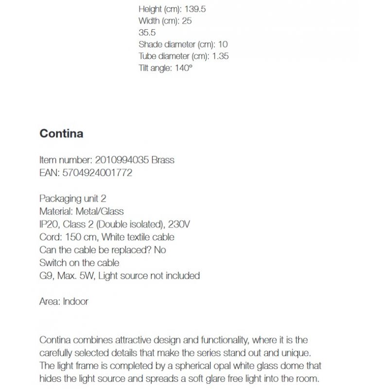 Contina este o lampă de podea frumoasă în finisaj alamă, care conferă căldură și confort în decorul strălucitor nordic. Lampa de masă elegantă are multe funcționalități și aplicații, deoarece capul lămpii poate fi rotit pe ambele părți, iar simultan partea superioară a cadrului poate fi reglată în sus și în jos. Lumina este completată de o cupolă sferică din sticlă albă opacă, care ascunde sursa de lumină și răspândește o lumină moale fără strălucire în cameră.