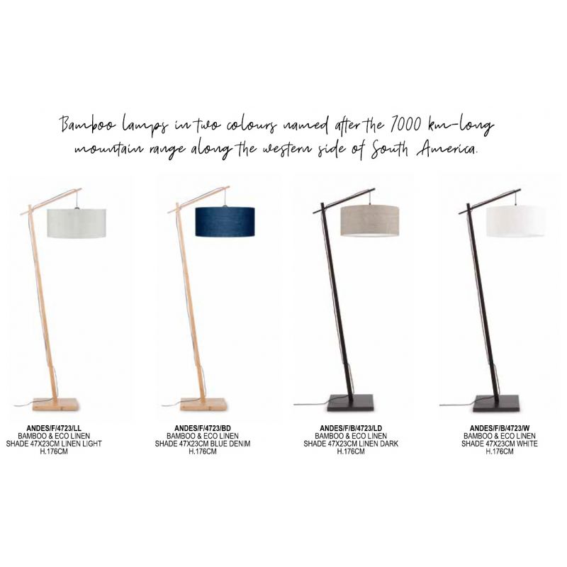 Numit după lanțul muntos sud-american tropical, gama Andes combină o estetică industrială cu fructele naturii. Pentru cadrul lampii s-a folosit lemn fin de bambus și tesatură de înaltă calitate pentru abajur, care emite o lumină plăcută. Designul modern și abstract se remarcă minunat de alte lumini clasice și face lampa ideala ca lampă de lectură sau lampă de birou. Iluminează colțurile întunecate cu lampa de podea și bucură-te de senzația bună pe care ți-o aduc conștientizarea și designul mediului.