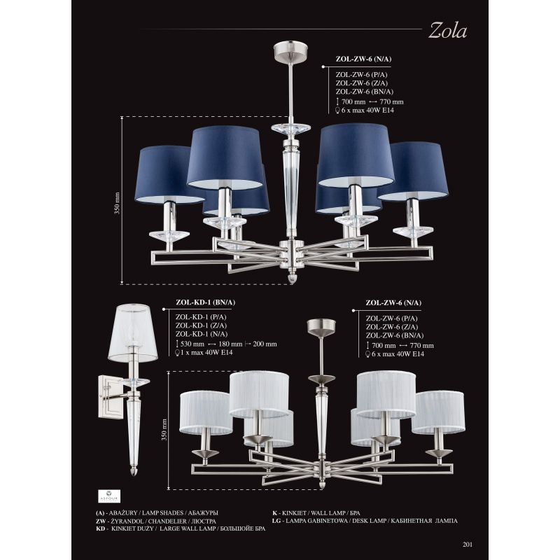 Colecția de lustre Zola vor oferi un stil rafinat și o frumusețe sofisticată interiorului, în care vor fi instalate. Din gamă face parte un candelabru, lampă de perete și lampă de masă cu abajur textil. Aceste lustre elegante sunt realizate manual din alamă. Lustrele din această colecție aparțin stilului modern, dar vor arăta grozav în designul clasic al unei clădiri și apartamente rezidențiale, al unui hotel sau restaurant la modă.