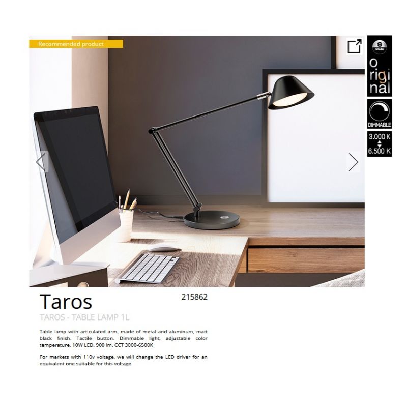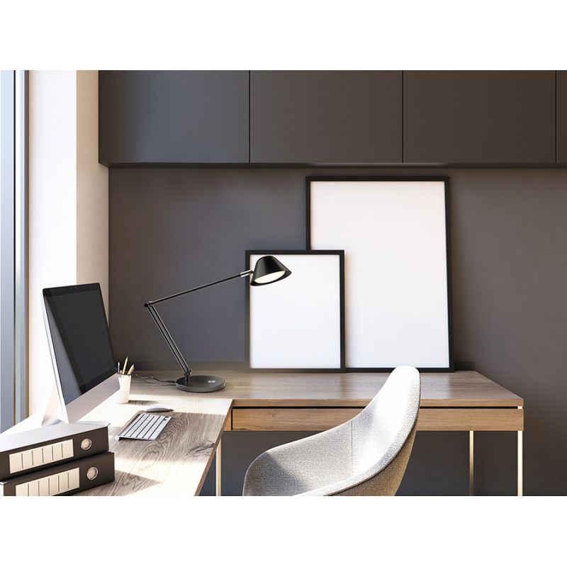 | Informatii produs: | lampa de birou cu brat articulat, din metal si aluminiu, finisaj negru mat, buton tactil, lumină reglabilă, temperatură de culoare reglabilă. |
