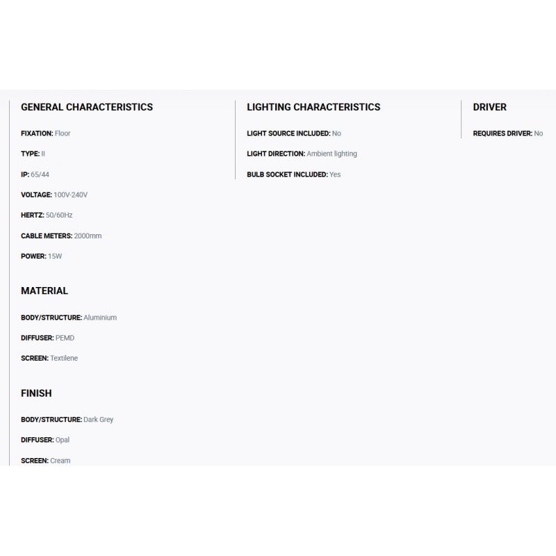 Materiale | aluminiu finisaj gri inchis, difuzor PEMD alb opal, abajurul din textilen crem (material de înaltă calitate care este foarte rezistent la schimbările de temperatură) |