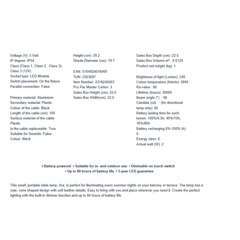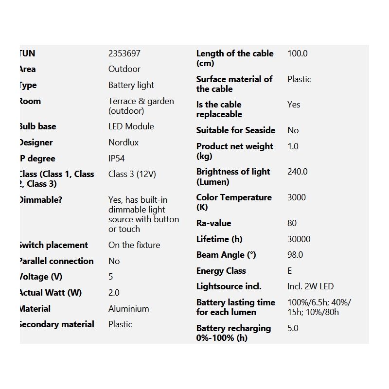 Informatii produs: | lampa de exterior portabila cu protectie la umiditate IP54, baterie reincarcabila:100%/6.5h; 40%/15h; 10%/8h |