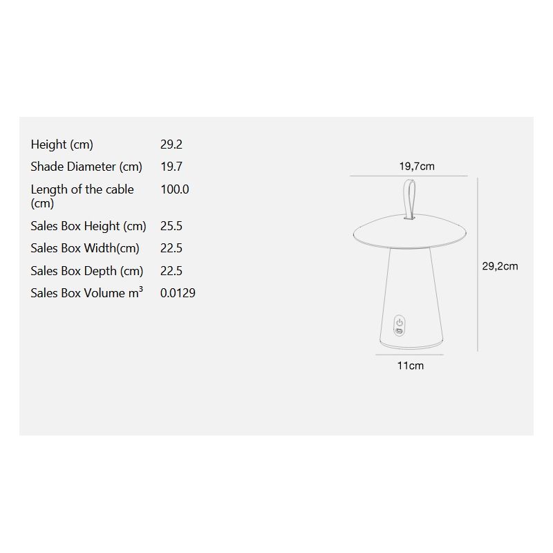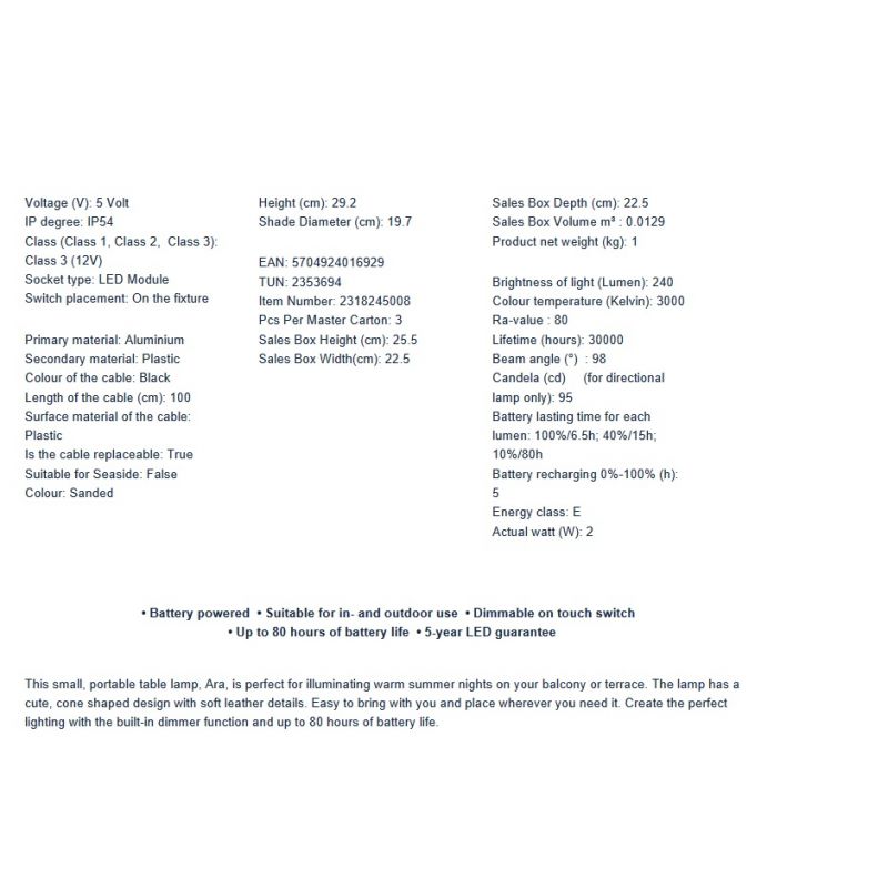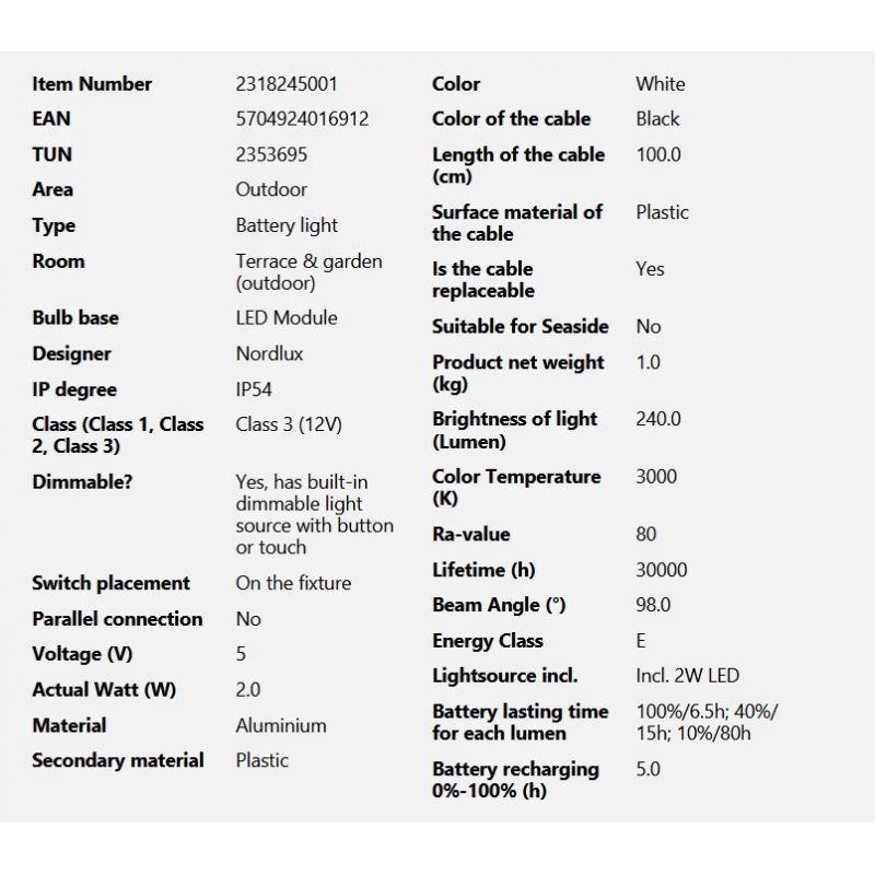 Informatii produs: | lampa de exterior portabila cu protectie la umiditate IP54, baterie reincarcabila:100%/6.5h; 40%/15h; 10%/8h |