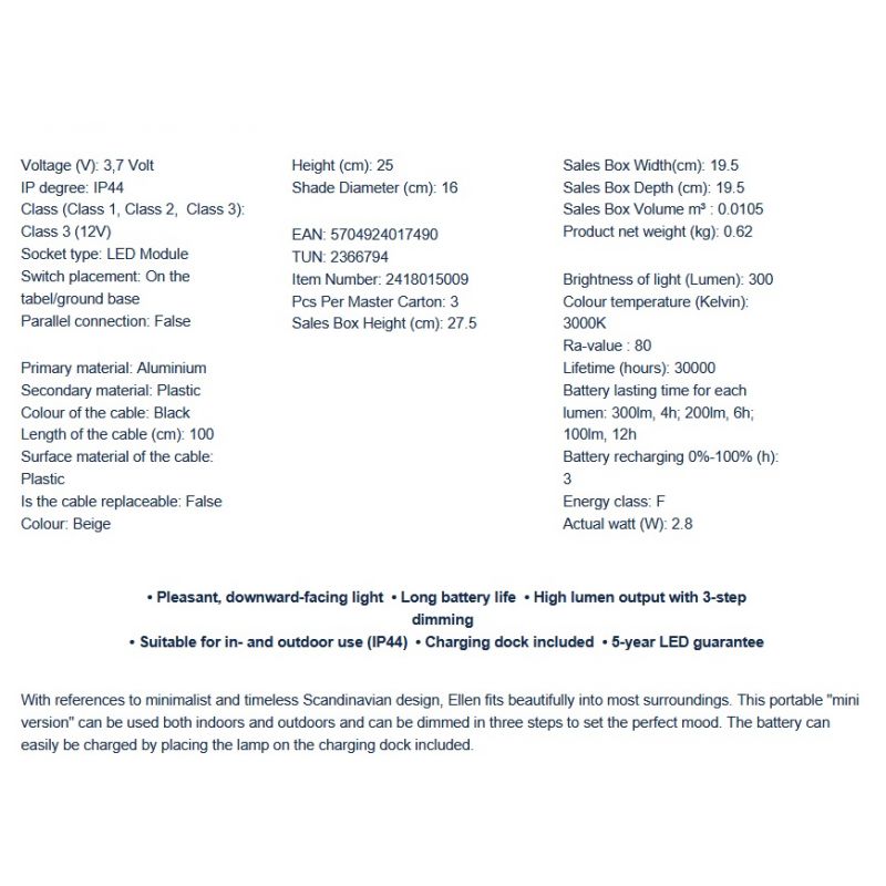 | Informatii produs: | lampa de exterior si interior portabila cu protectie la umiditate IP44, baterie reincarcabila, statie de incarcare inclusa. |