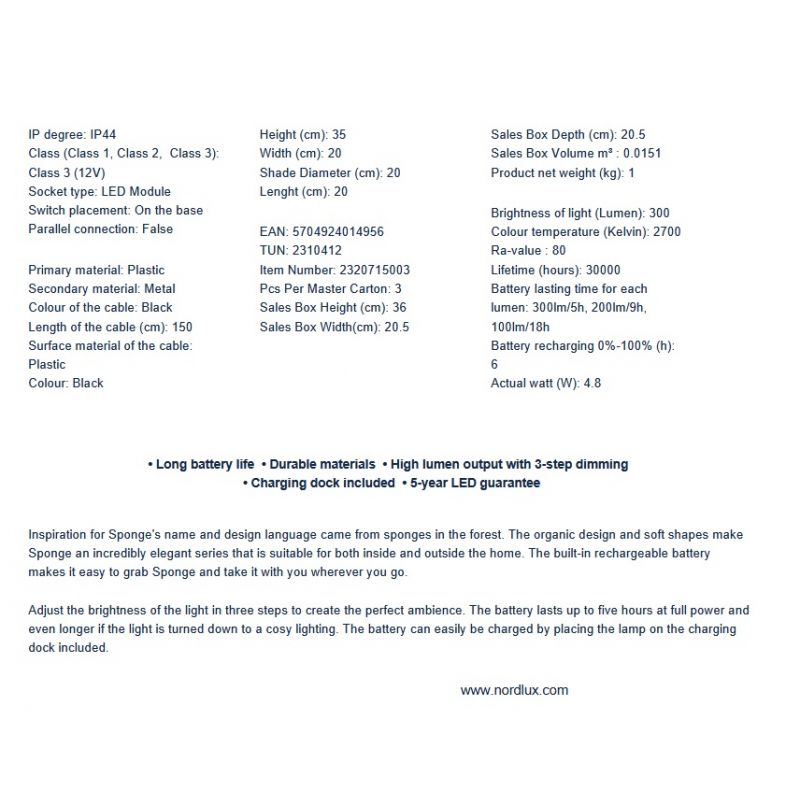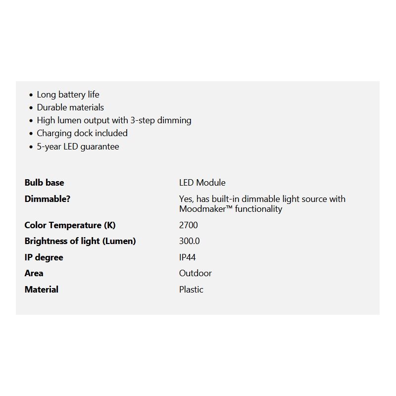 Informatii produs: | lampa de exterior si interior portabila cu protectie la umiditate IP44, baterie reincarcabila, statie de incarcare inclusa. |